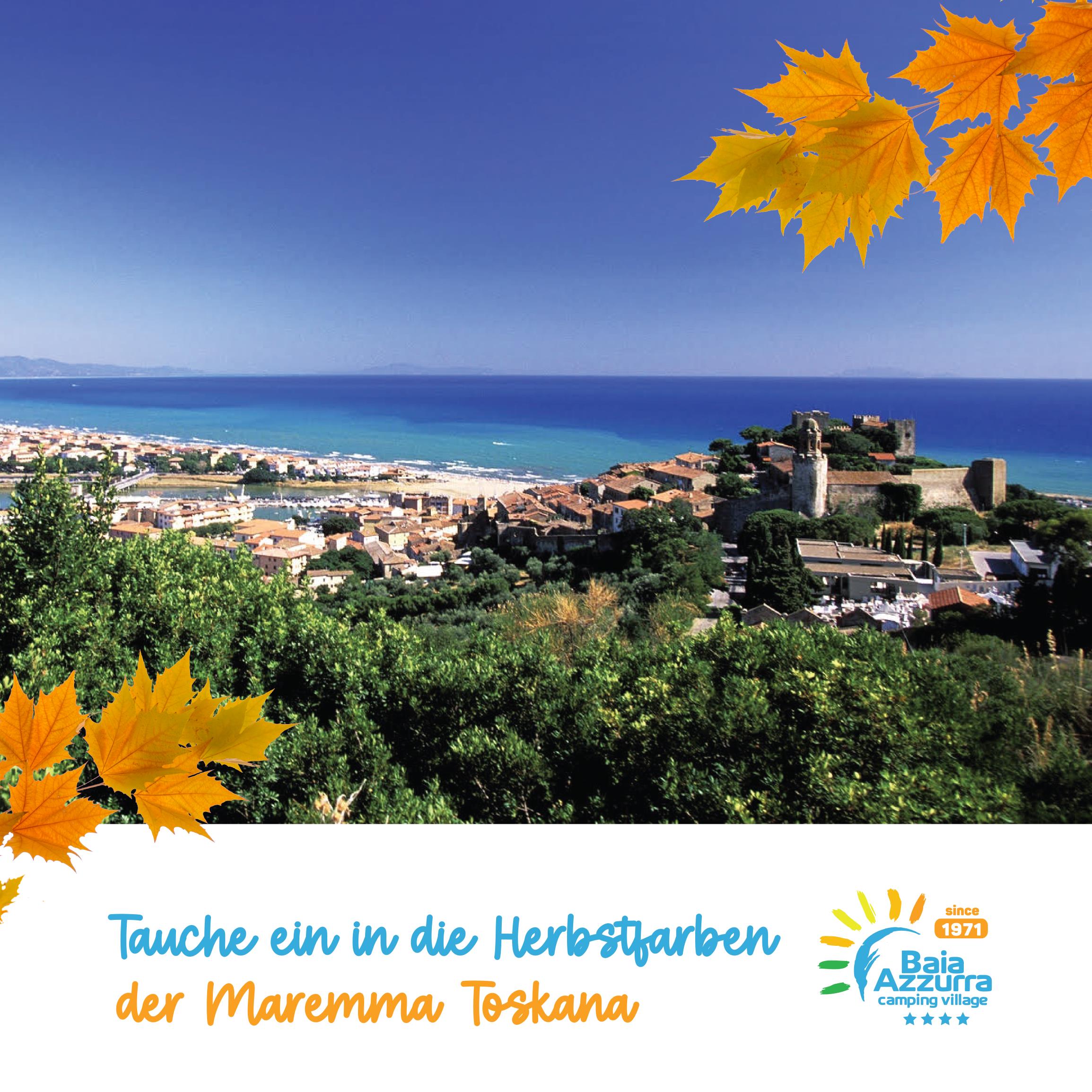 Oktoberferien in Italien: die toskanische Maremma wartet auf Sie Erleben Sie Ihre Oktoberferien in der toskanischen Maremma in Castiglione della Pescaia: die ideale Gelegenheit, um in Kontakt mit der Natur zu leben, die traditionellen Geschmäcker Italiens und der toskanischen Maremma zu entdecken und historische Städte und Naturparks zu Fuß oder mit dem Fahrrad zu besuchen. Das Baia Azzurra Camping Village erwartet Sie mit: - kulinarische und weinkundliche Touren zur Entdeckung der Geschmacksrichtungen der Toskana und der Maremma - lange Spaziergänge oder Fahrradtouren durch die Natur und die Städte - einen Sandstrand, sowohl öffentlich als auch privat - Wassersport wie SUP UND KANU - Schwimmbäder für alle Alter mit Gruppenaktivitäten - den Spray Park, eine Lagune mit Wasserspielen für Kinder und Jugendliche - Animation und Spaß für die ganze Familie - Sportplätze, um auch im Urlaub seinen Leidenschaften nachzugehen: Tennis, Padel-Tennis, Fußball und Beachvolleyball - ein Restaurant, um die traditionellen Gerichte der toskanischen Maremma zu genießen - ein Fahrradverleih, um Fahrräder zu mieten und natürliche Wege zu entdecken. Finden Sie mehr heraus und buchen Sie jetzt.