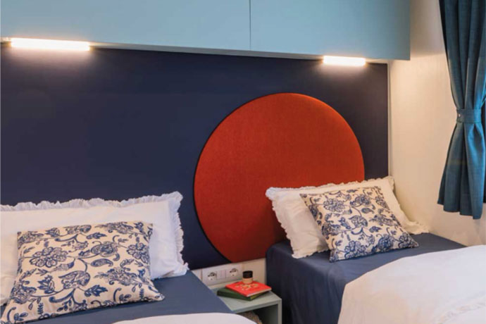 Design furnishings: double bedroom, bedroom with 2 single beds, bathroom with toilet, bidet and shower, living area with sofa and dining room with kitchenette.
