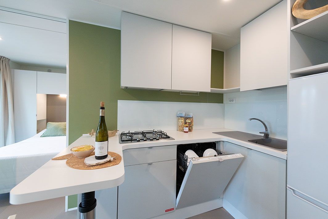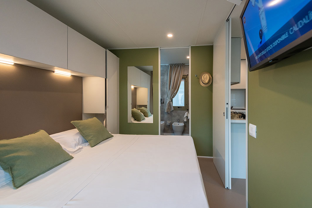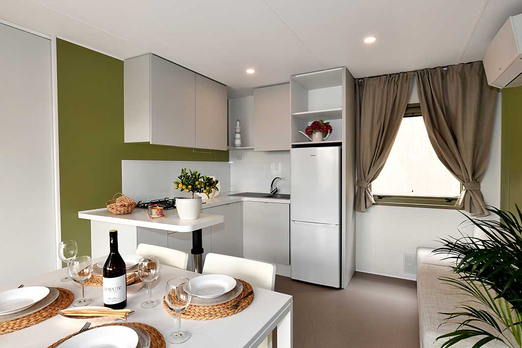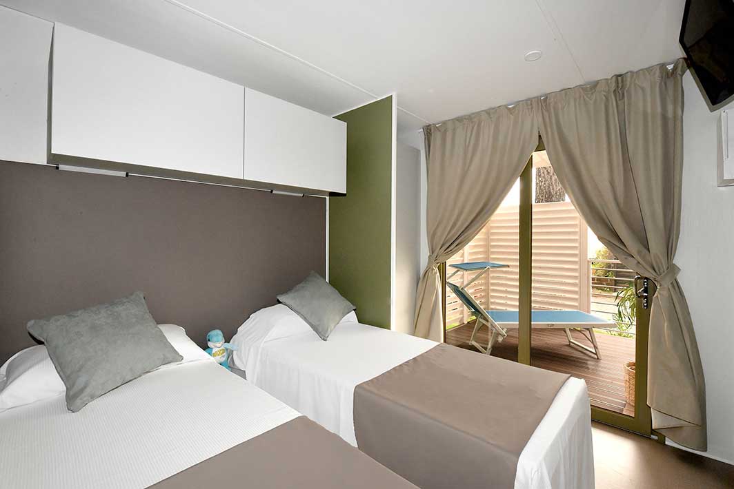 Un design moderne aux couleurs harmonieuses caractérise ce bungalow de trois pièces de 40 m2. La chambre double dispose d'une salle de bain avec WC, bidet et douche maxi ; la chambre avec deux lits simples dispose d'une salle de bain avec WC et douche maxi. Le salon ouvert dispose d'une cuisine entièrement équipée et d'un canapé-lit. Climatisation (chaud/froid), lave-vaisselle, TV.