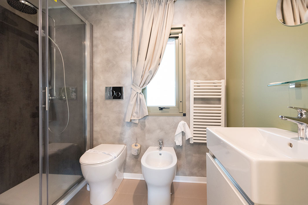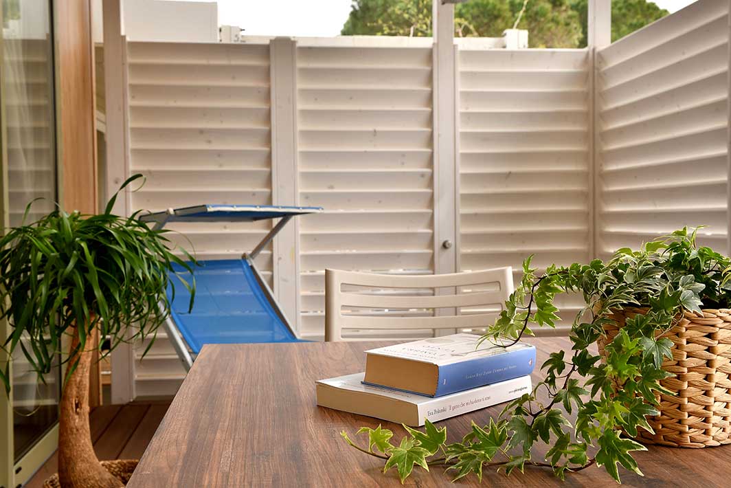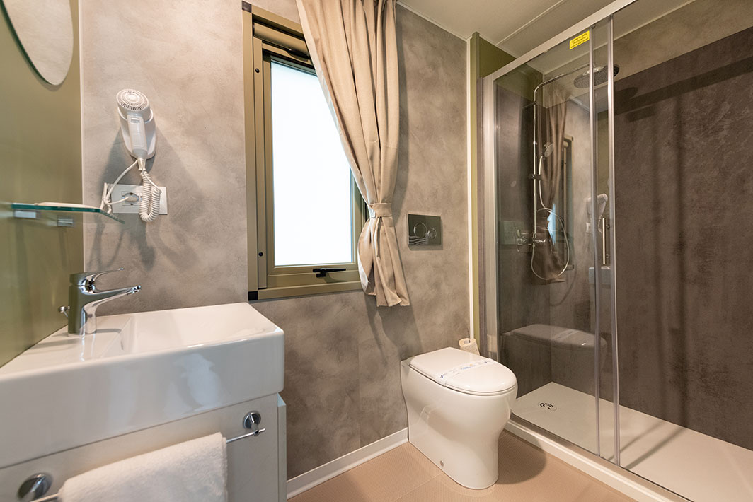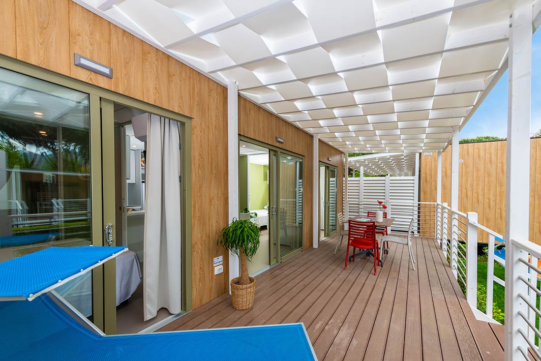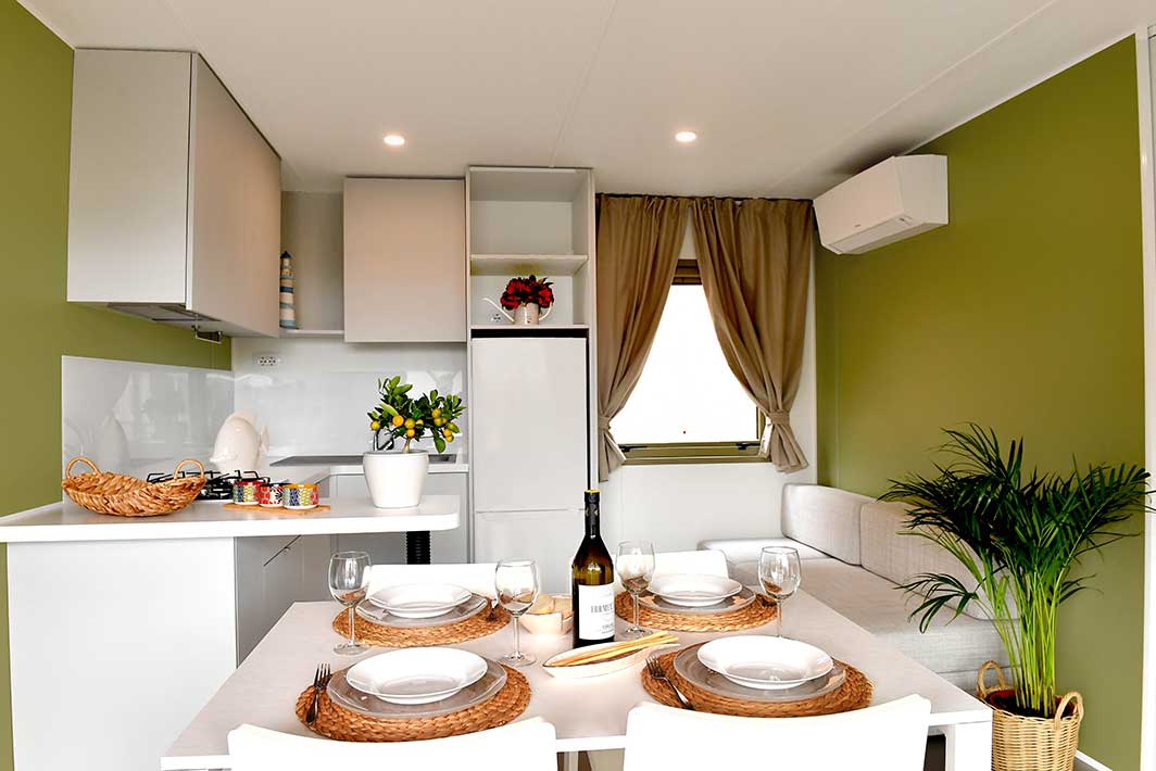 Un design moderne aux couleurs harmonieuses caractérise ce bungalow de trois pièces de 40 m2. La chambre double dispose d'une salle de bain avec WC, bidet et douche maxi ; la chambre avec deux lits simples dispose d'une salle de bain avec WC et douche maxi. Le salon ouvert dispose d'une cuisine entièrement équipée et d'un canapé-lit. Climatisation (chaud/froid), lave-vaisselle, TV.