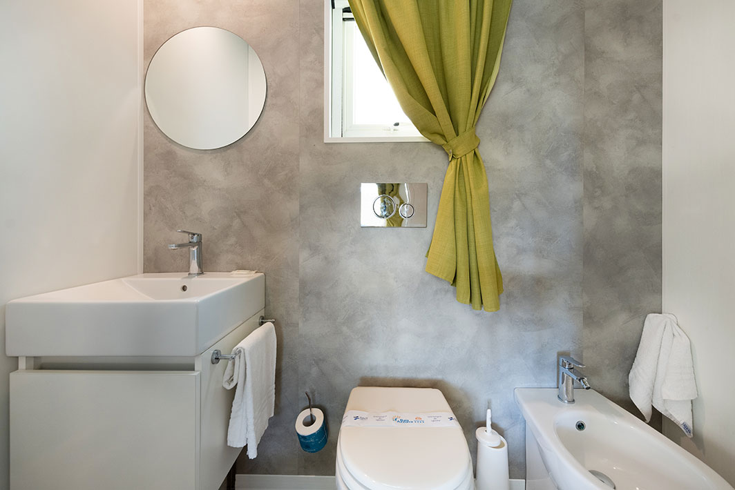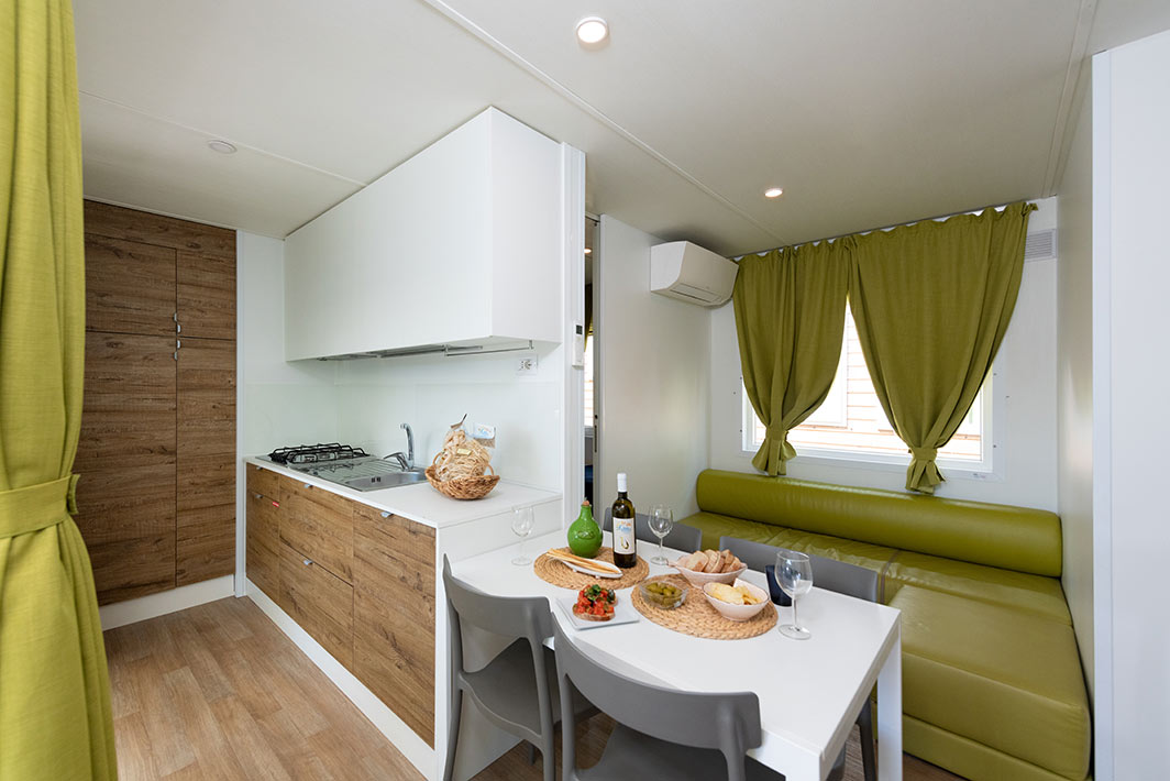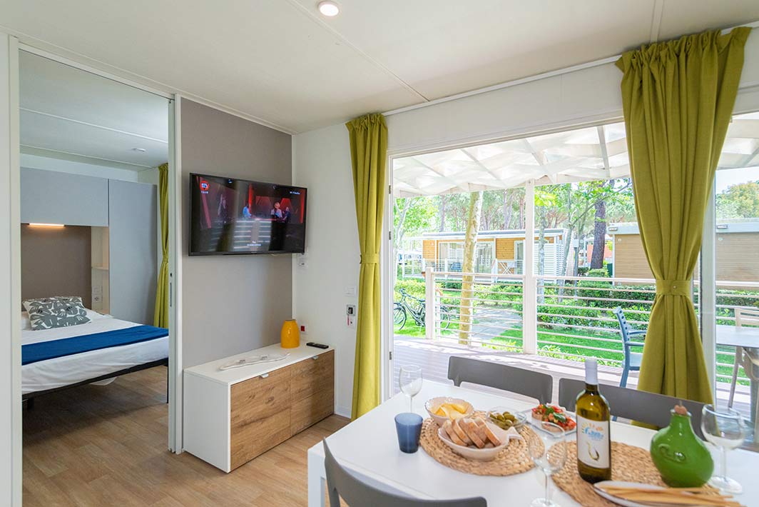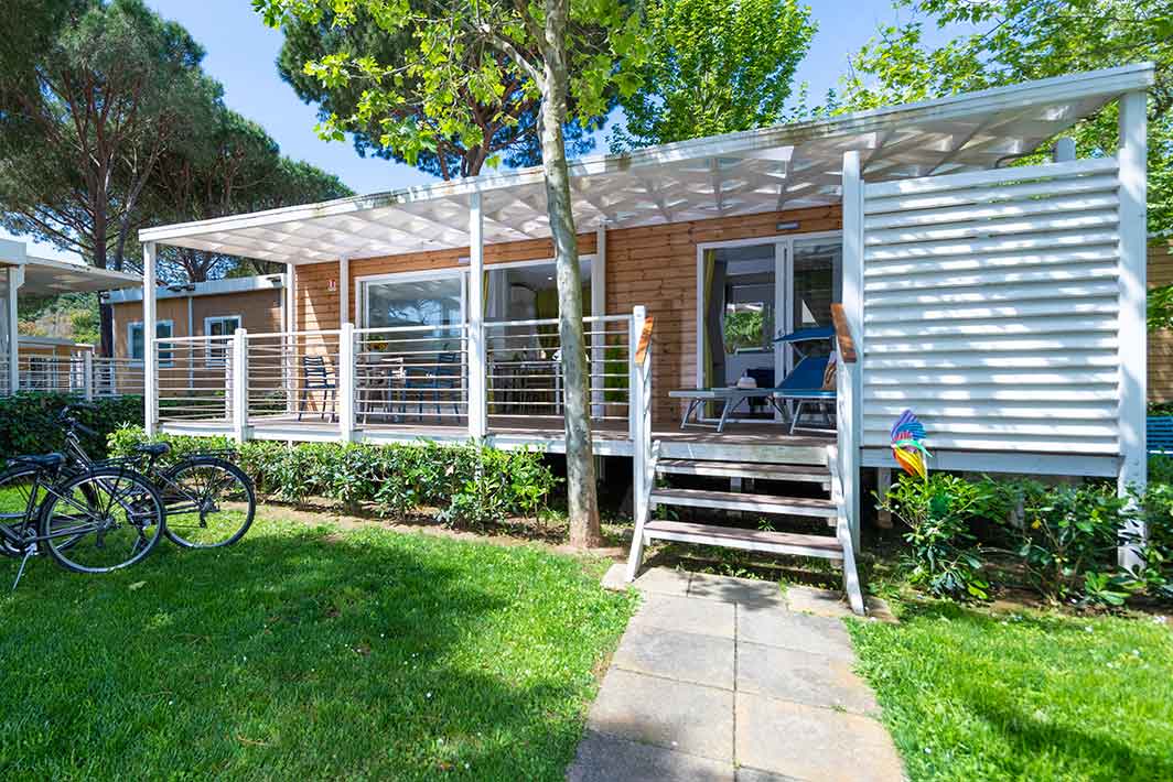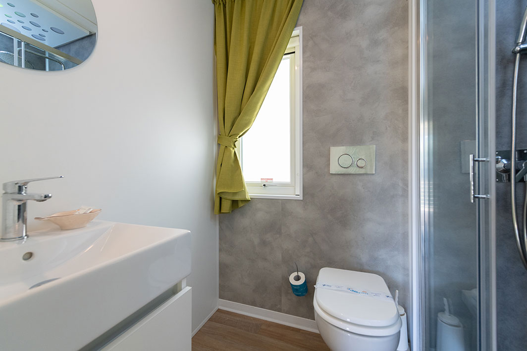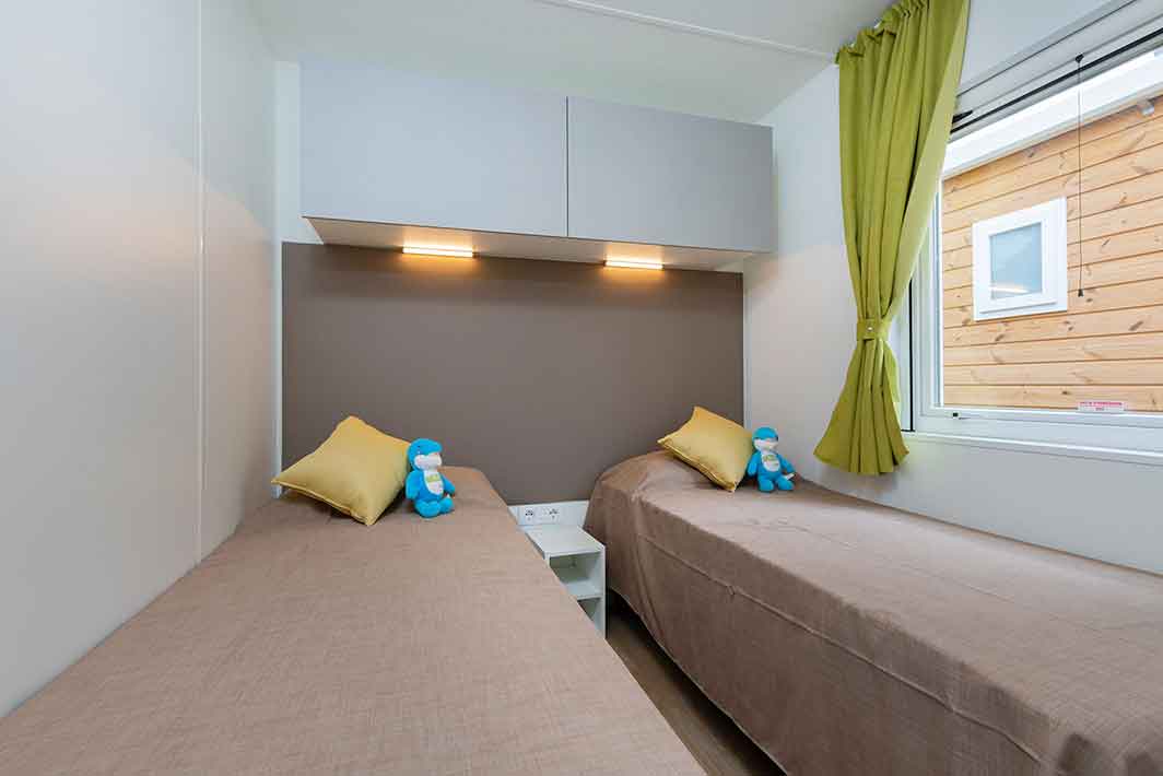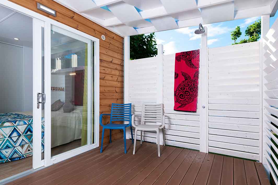 Bungalow de 38 m2, aux finitions raffinées et au mobilier design. Entrée de la véranda équipée de table et chaises, jardin de taille variable avec chaises longues et douche extérieure. Séjour / salle à manger avec canapé, kitchenette équipée avec vaisselle, TV (écran plat). 2 chambres: 1 double avec salle de bain et 1 avec 2 lits simples. Salle de bain avec douche dans le salon. Climatisation.